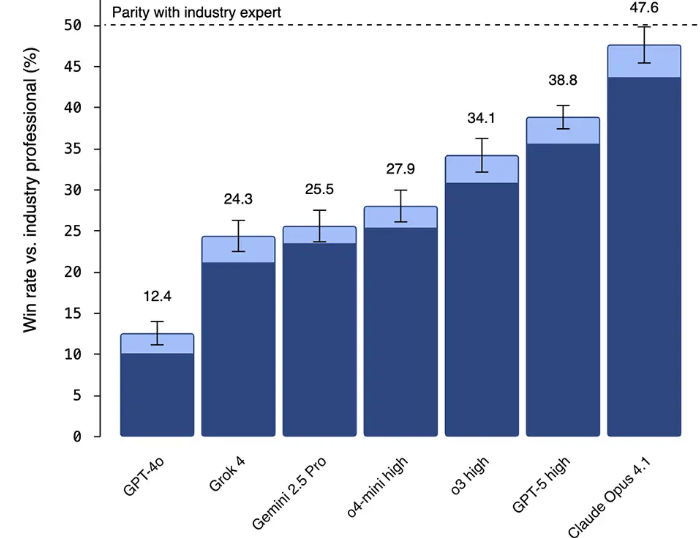 And it’s not just coding toys. OpenAI’s GDPval benchmark tested 44 real professions with 1,300 tasks judged by industry veterans. GPT-5 is basically human-level, while Claude Opus 4.1 is already matching experts with 14 years of experience.