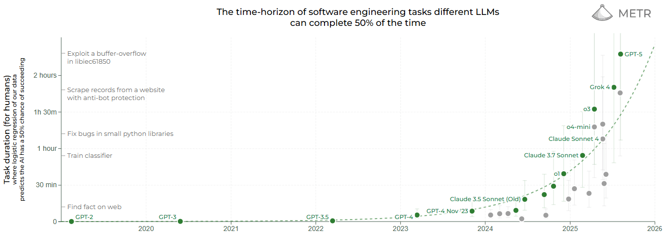 Grok 4, Opus 4.1, and GPT-5 aren’t just on trend but overshooting METR’s own exponential forecast (graph updates in real-time).