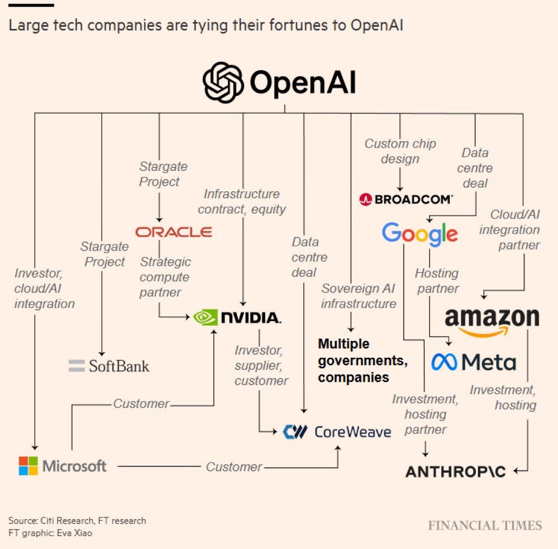 In just two weeks, Nvidia pledged $100B to OpenAI, which in turn committed to buying millions of Nvidia chips. Then OpenAI struck a similar multibillion-dollar deal with AMD, becoming one of its largest shareholders. Oracle joined in with a $300B infrastructure pledge, much of it powered by Nvidia hardware.