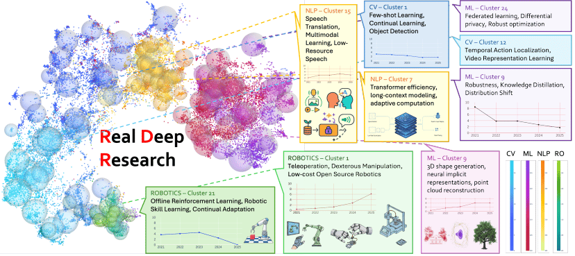 It organizes knowledge like a scientist: clustering ideas, labeling emerging fields, and predicting which topics are accelerating vs burning out, like teleoperation and dexterous manipulation surging, while classic RL stalls.