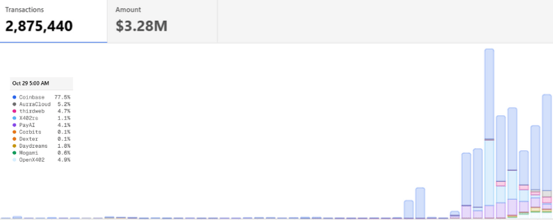 x402-enabled traffic ripped to 2.8M+ transactions and $3.28M settled value this week, up from near zero a few days ago.