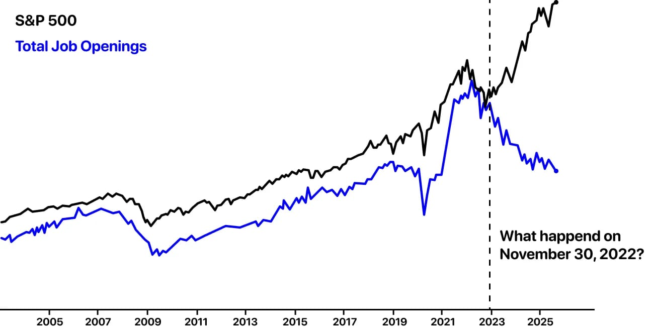 This single chart tells the story: since the day ChatGPT went live, the S&P 500 has surged 40% while U.S. job openings have collapsed back to 2019 levels. For decades, those lines rose together. Now, capital is compounding without labor.